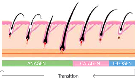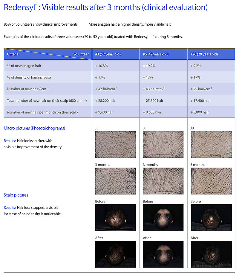 Unlike Minoxidil containing products there are no side effects or health issues associated with the use of Redensyl. Unlike rinse off products which seem self defeating, our product is a leave on product which creates the best possible scenario for allowing the active agents to work. Redensyl hair growth serum featuring the Award Winning Redensyl: The scalp bears an average 110,000 hair follicles which, at different rates are growing and falling on a daily basis. When the balance between the growing hair and the falling ones is altered, then hair loss starts and baldness appears. 1) Re-launching stem cells activity and proliferation. Uni-protect T-43: is another main ingredient, and the main reason for its inclusion is that “Uni-protect T-43” contains a chemical called ATP. This is the energy source that cells require in order to divide. It works like this, first Redensyl wakes the cells up in the scalp, the “Uni-protect T-43” ATP then provides cells with the energy boost to trigger cell division and growth. “Uni-protect T-43” also contains chemicals that protect the skin from UV radiation. When you think about how many people with thinning hair end up burning their scalp, its a good ingredient for us to have included in our hair serum. Hair loss in numbers: The normal cycle for hair: The hair cycle is made of three phases: Hair loss and stem cells: Our product effectively reduces the Telogen phase and increases the Anagen phase, hence hair is re-grown and maintained effectively. Alternative to our product is Minoxidil or caffeine products : Several of the most popular hair growth products are shampoos or caffeine liquids. Just have a think about this for a moment. A shampoo is designed to be rinsed off the hair shortly after use, so any active ingredients contained in the shampoo are rinsed off. So what's the point? Minoxidil is the active ingredient contained in several over the counter hair growth products. Minoxidil has been clinically proven to retard hair loss and promote hair growth. However Minoxidil has quite an alarming list of potential side effects: