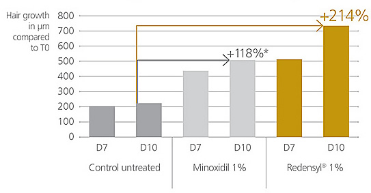 Furthermore most of the success stories have come from younger men with fairly minimal hair loss occurring over no longer than 5 years. What's different about our product? Our Hair Growth Serum features the award winning Redensyl active ingredient. The positive results obtained during the clinical trials was using 1% Redensyl, our product contains 3% Redensyl, so you can be sure you are getting the best possible chance of success. The active ingredient is contained in a serum designed to enhance delivery and penetration of the active to the scalp. Unlike Minoxidil containing products there are no side effects or health issue associated with the use of Redensyl. Unlike rinse off products which seem self defeating, Redensyl is a leave on product. Redensyl was tested alongside Minoxidil and the results showed that Redensyl is 90% more effective than Minoxidil.